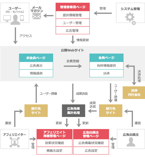 - 紹介者(アフィリエイター)向けの成果測定と管理機能